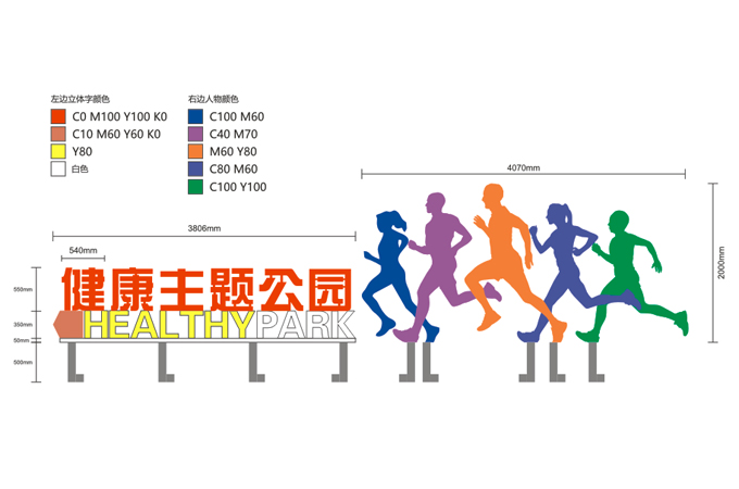 2、健身要素:环境元素造型结合运动剪影,烘托健康主题公园的运动气氛。通过运动剪影造型的韵律、节奏、张弛有度和色彩的多样化以及活力与激情的风格,用以体现人们的丰富多彩的健康生活。